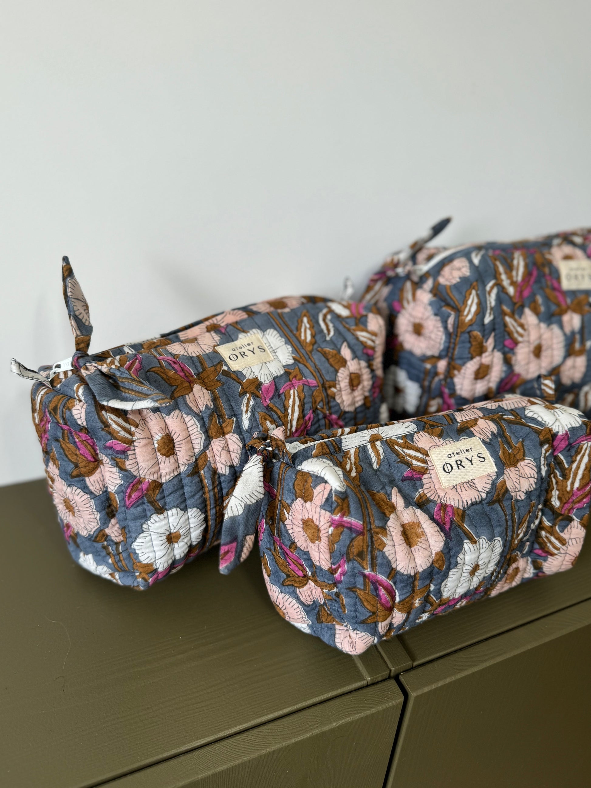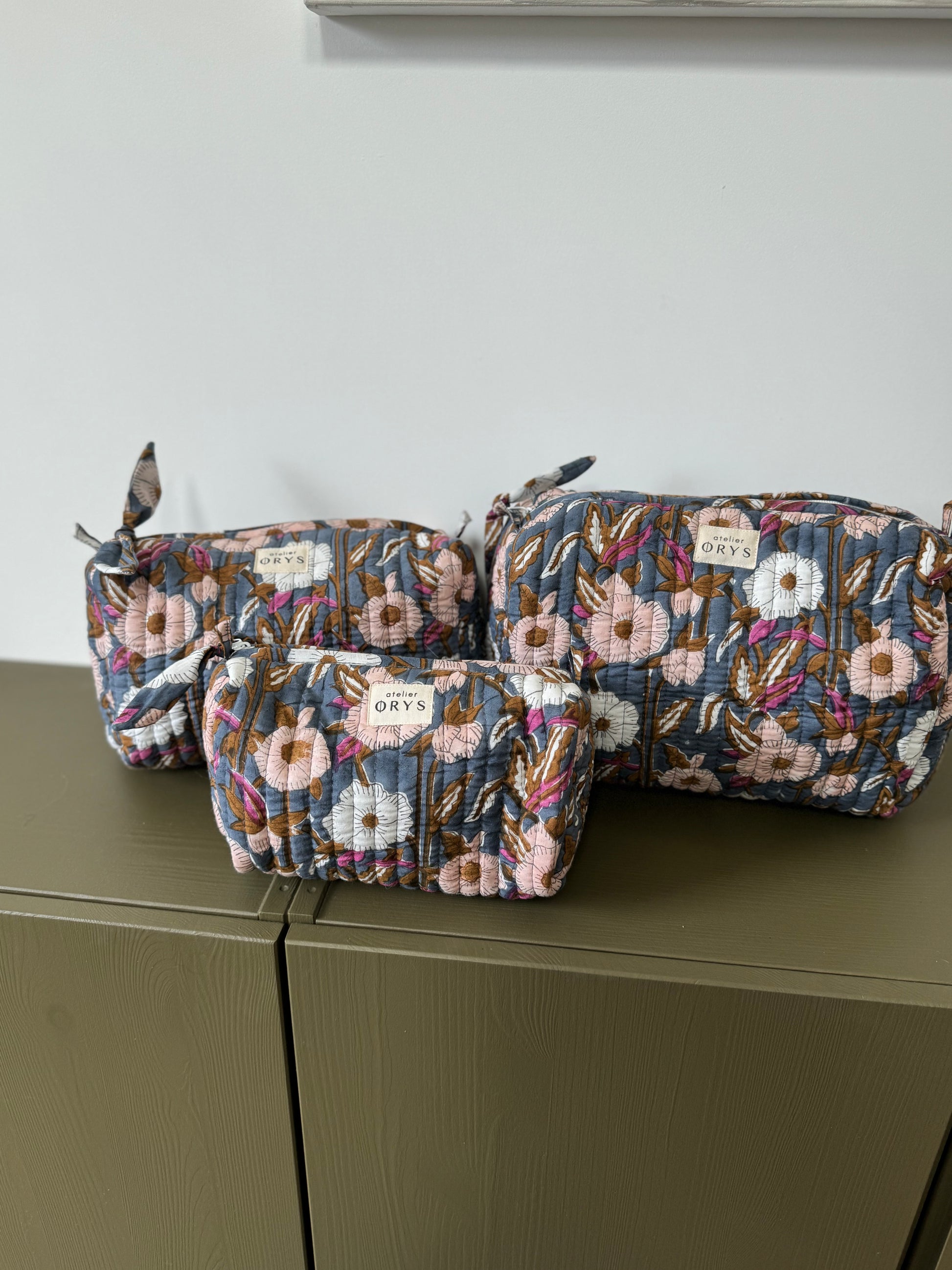 Trousse de beauté ou de toilette en tissu matelassé fleuri bleu gris - Olympe Bleu encre