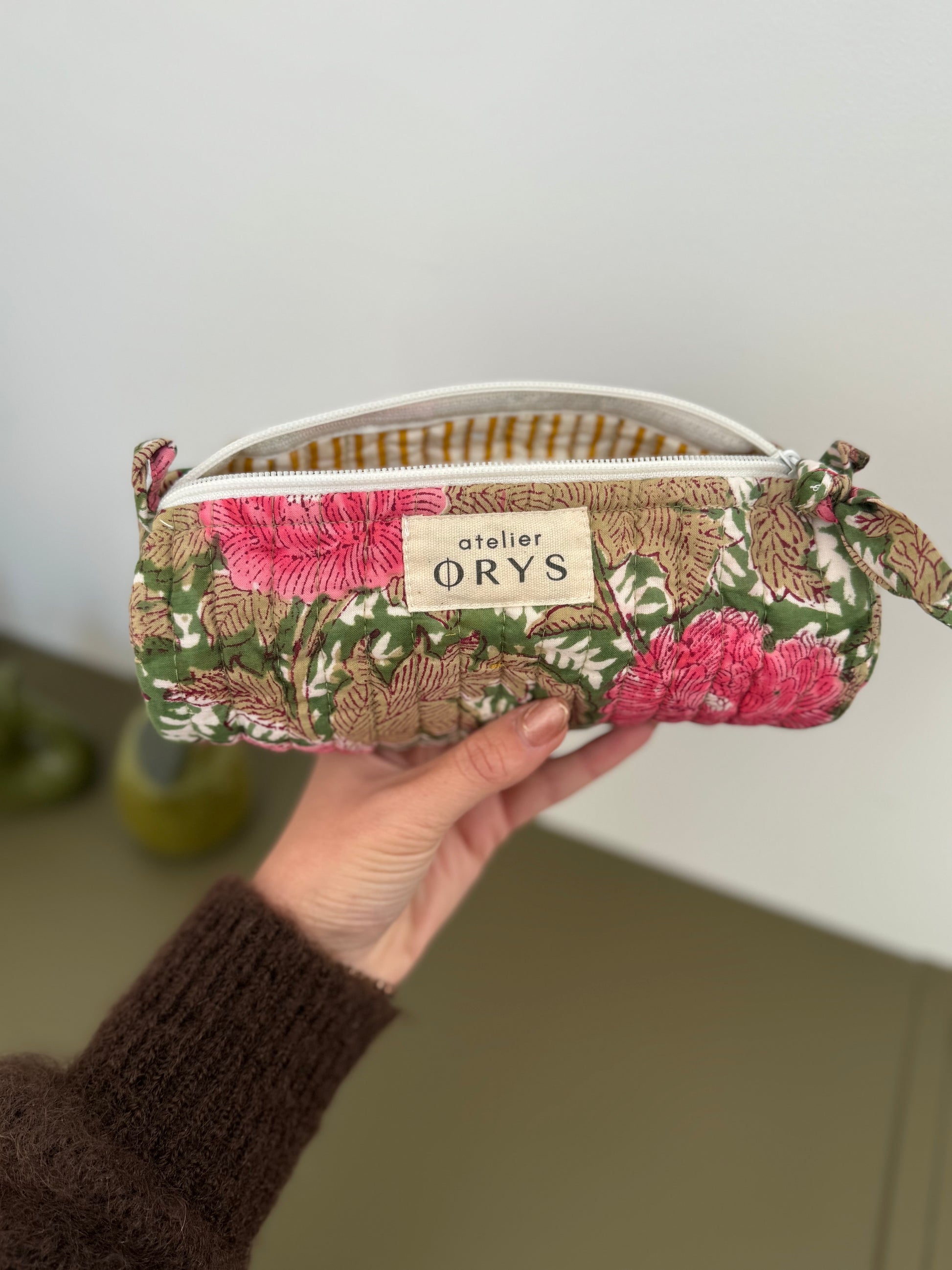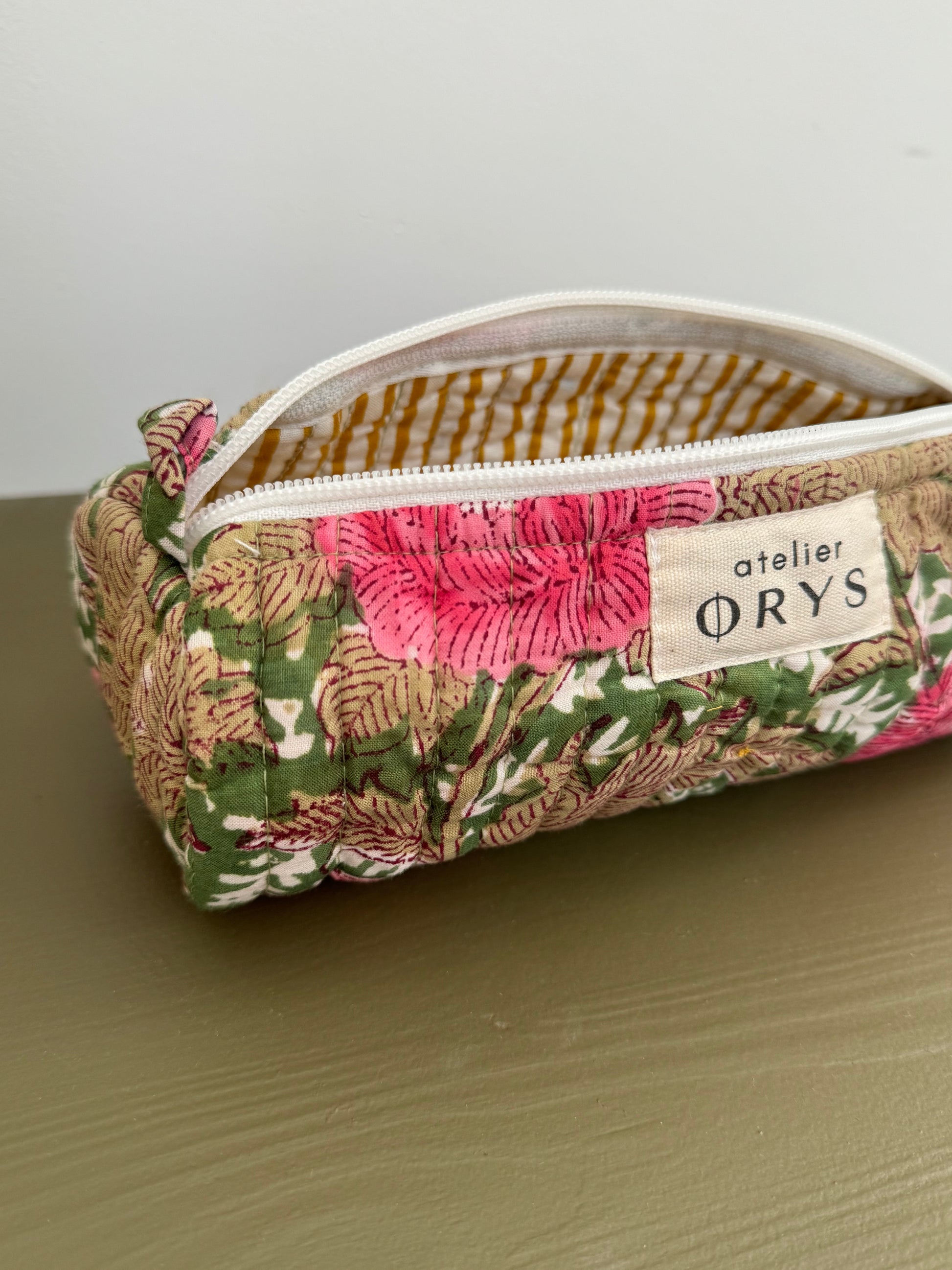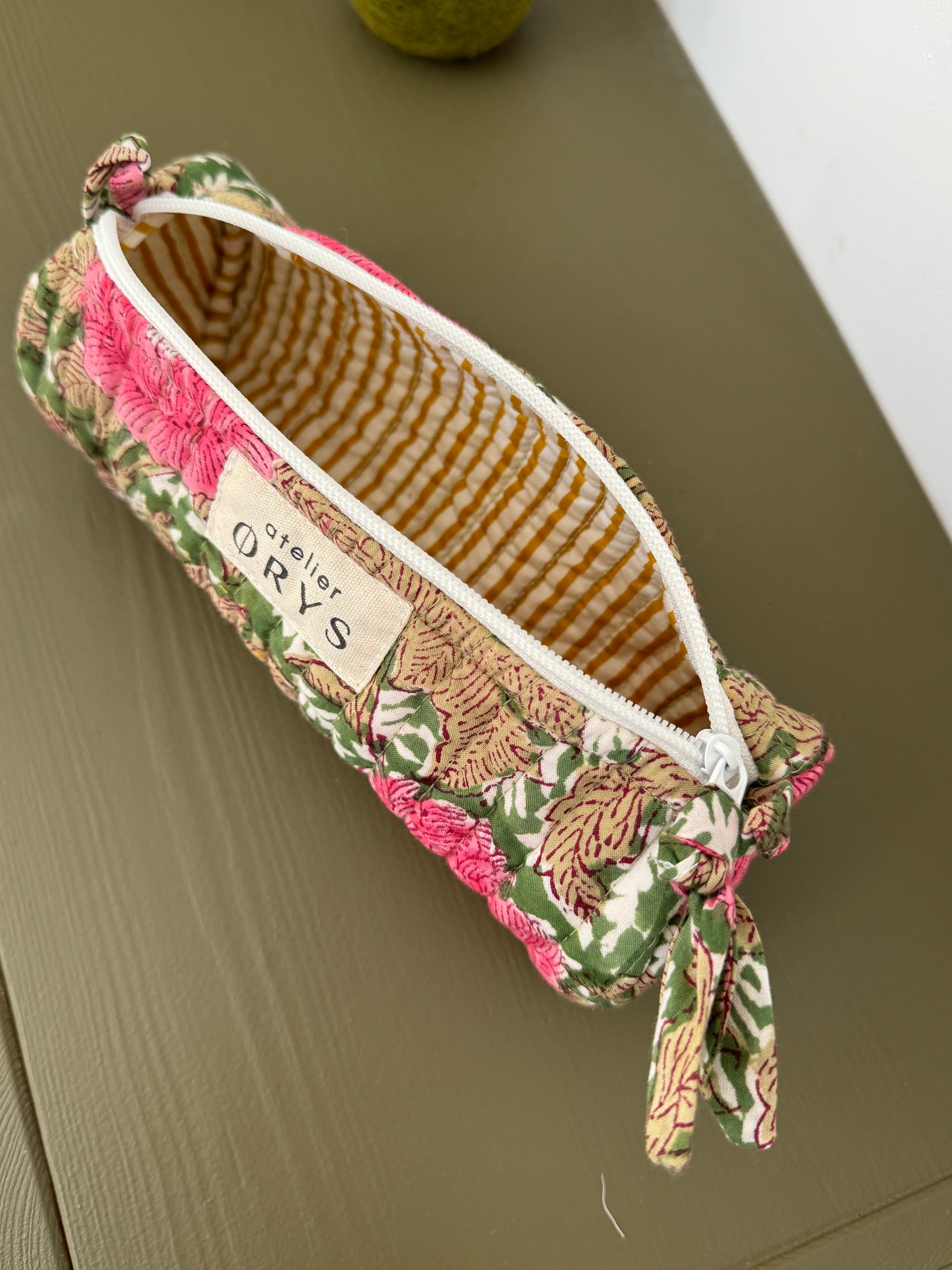 Trousse scolaire matelassée pour crayons en tissu Indien blockprint, motif floral fuchsia et vert