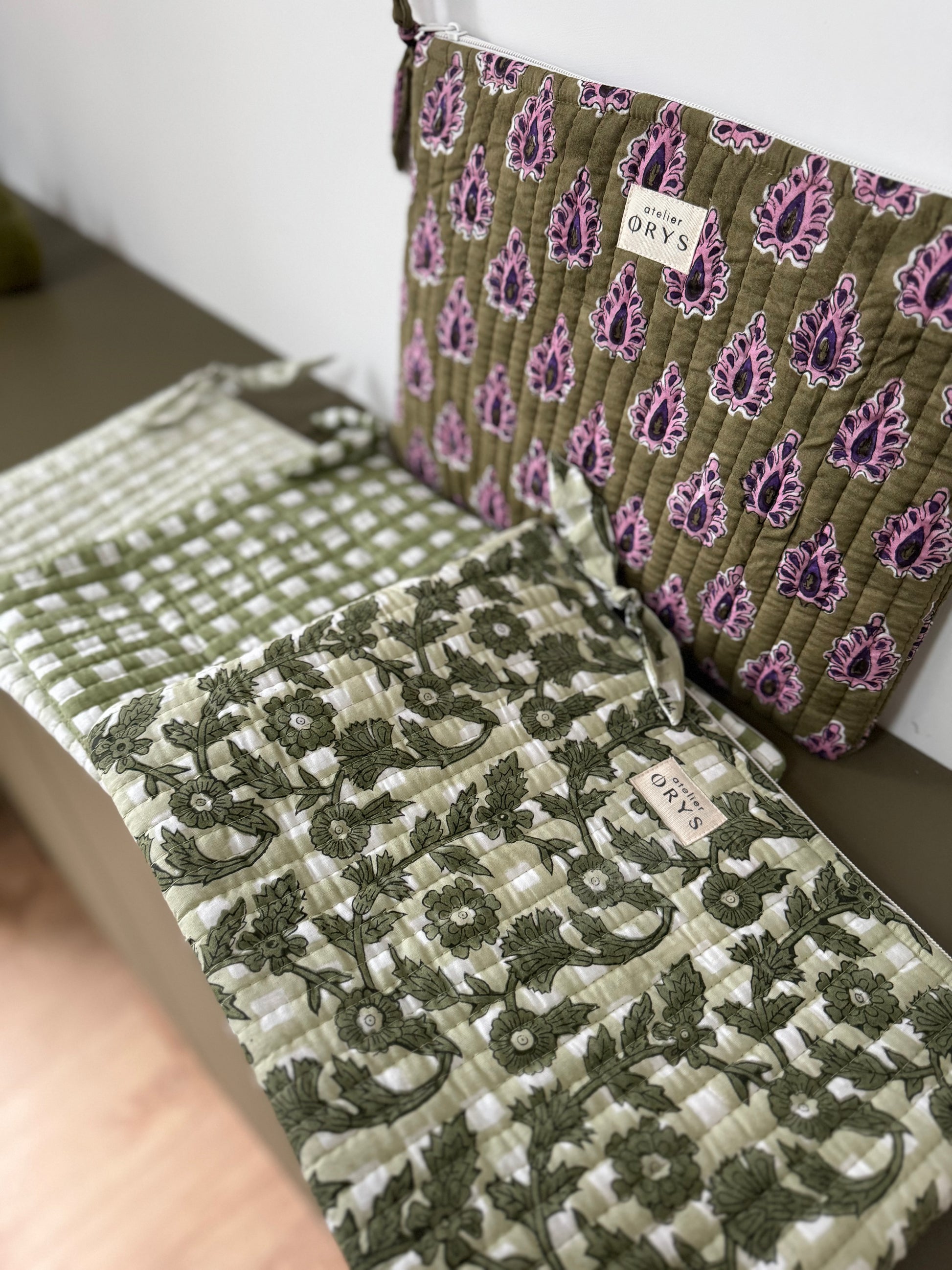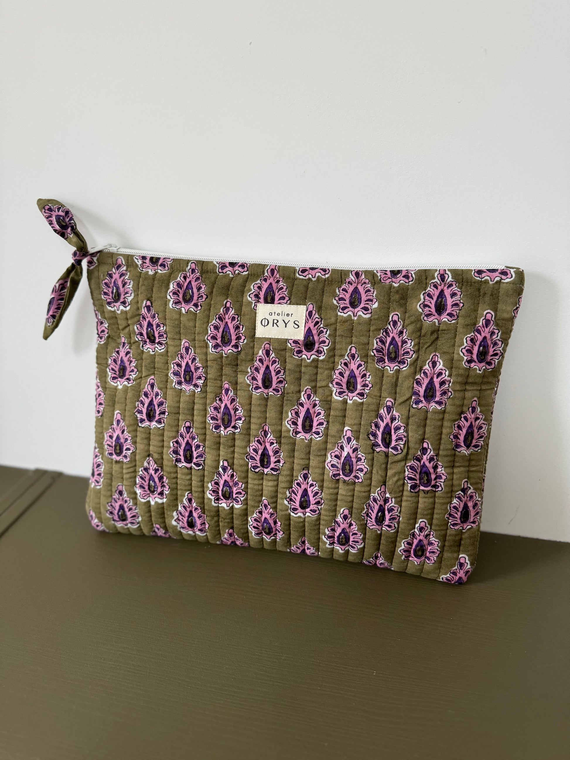 Pochette matelassée pour ordinateur en tissu blockprint, motif indien kaki mauve- Carmen