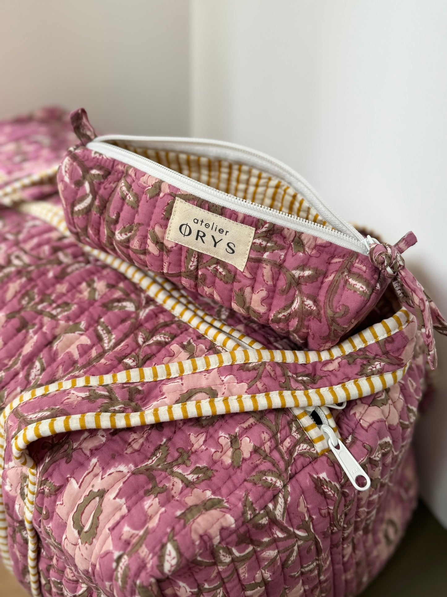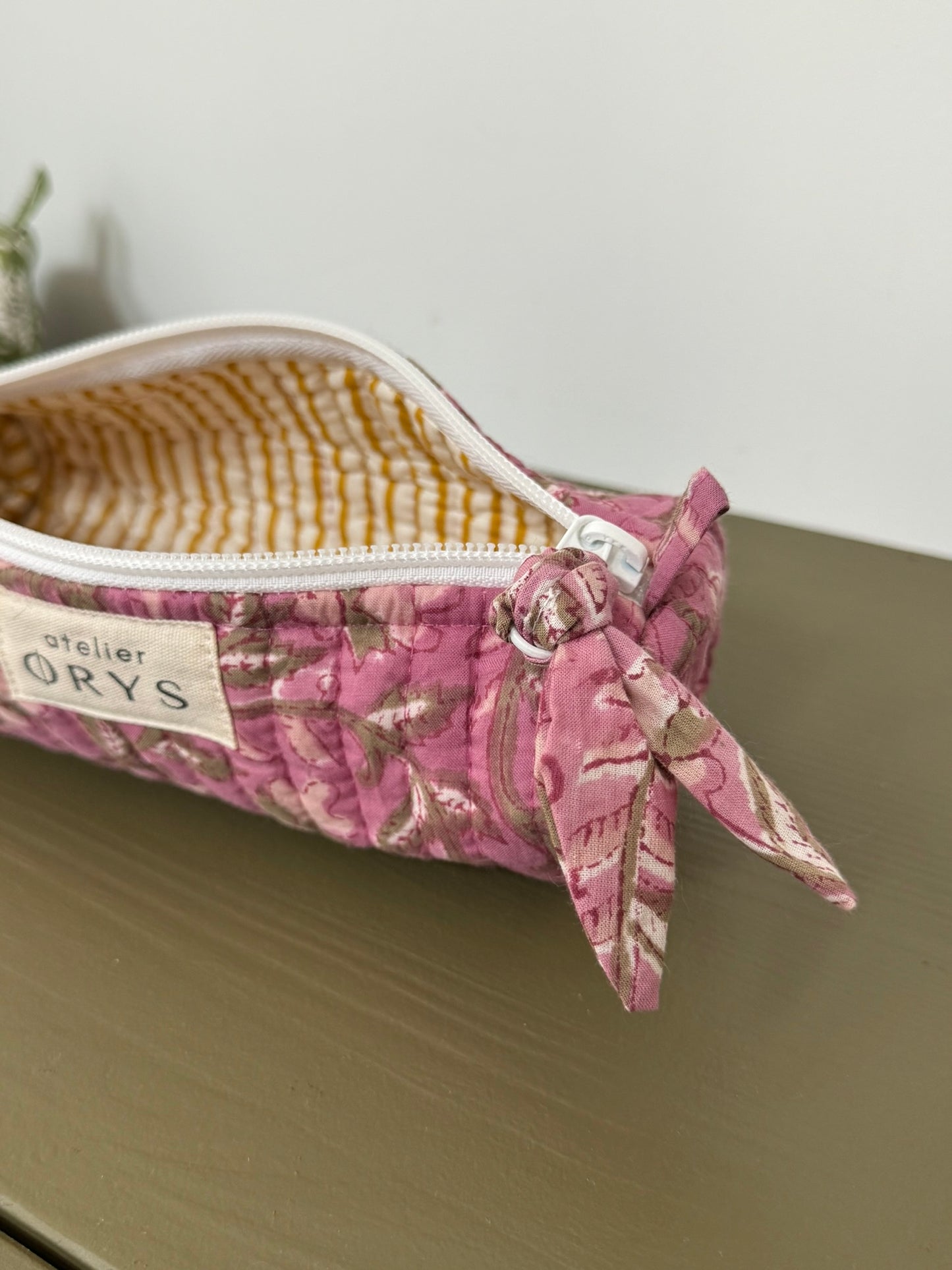 Trousse à crayons matelassée en tissu Indien blockprint, motif floral violet et doublure rayée