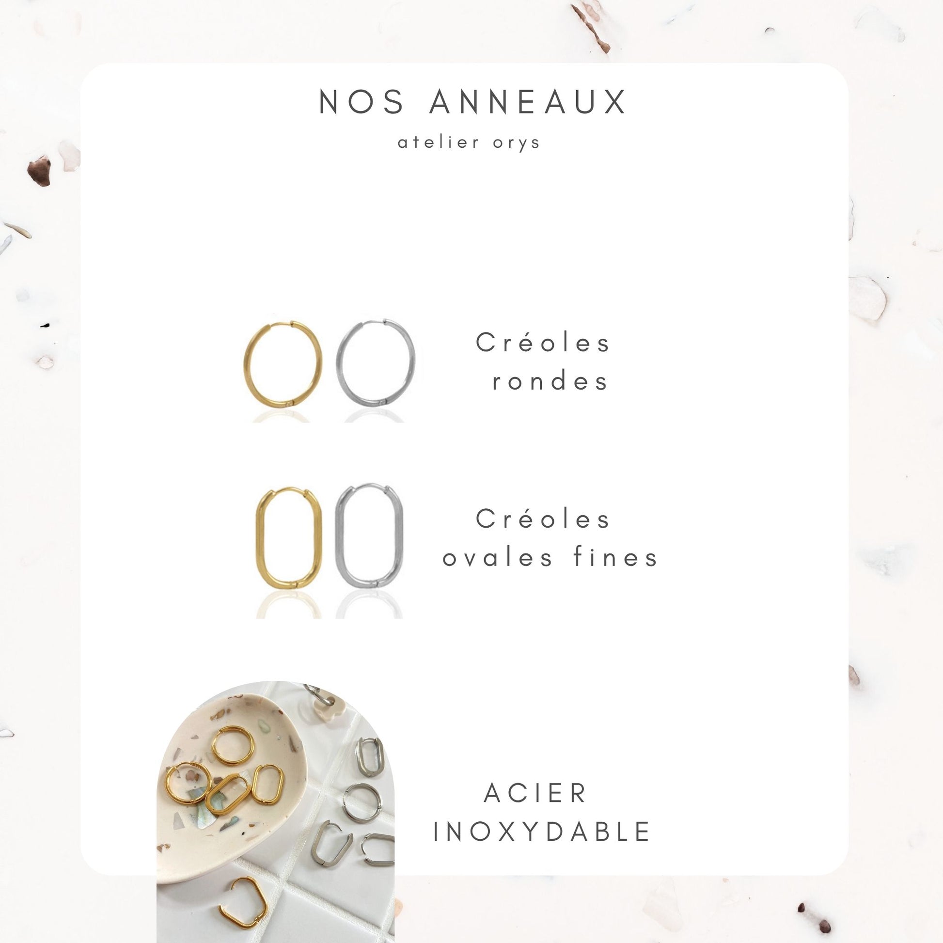 Nos créoles en acier inoxydables sont disponibles en doré ou argenté. Vous avez la possibilité de choisir entre trois type de boucles, elles seront ensuite assemblés sur mesure rien que pour vous.