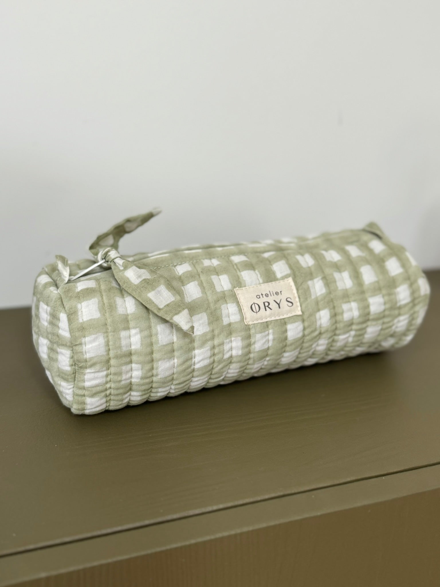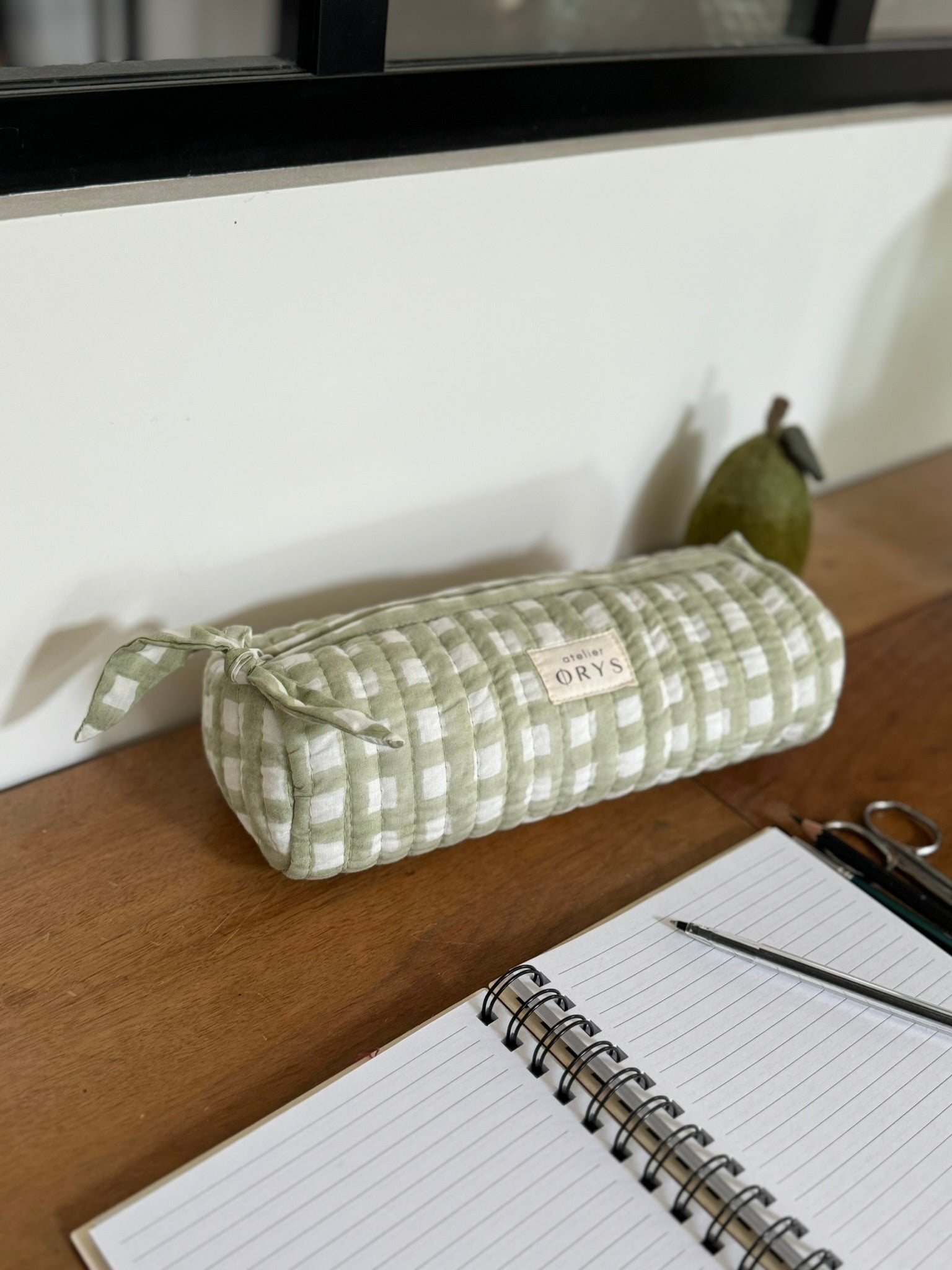 Trousse à crayons matelassée en tissu Indien vichy modèle Ysé vert menthe